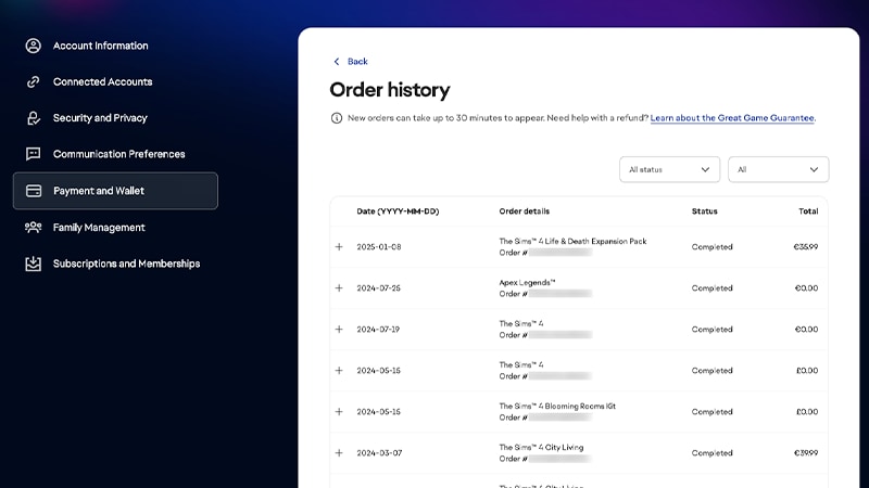 Your Order History is where you'll find info about the transactions on your EA Account, including their status.