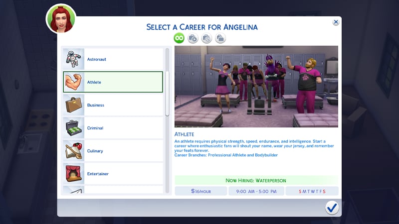 A menu for choosing a career in The Sims 4 highlights the Athlete career showing the hourly rate, and working days/times.Here’s a breakdown of all ranks of the Athlete career.