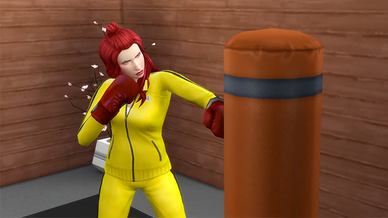 To join this career, select Find a Job from the phone or computer and choose Athlete.A red-haired SIm in a yellow tracksuit wears red boxing gloves as she works out using the punching bag in The Sims 4.