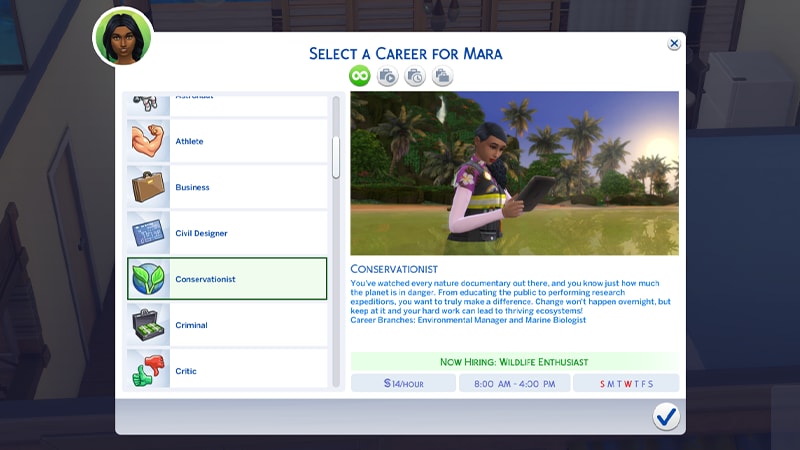 The Conservationist career comes with The Sims 4 Island Living Expansion Pack and splits into two branches:- Environmental Manager