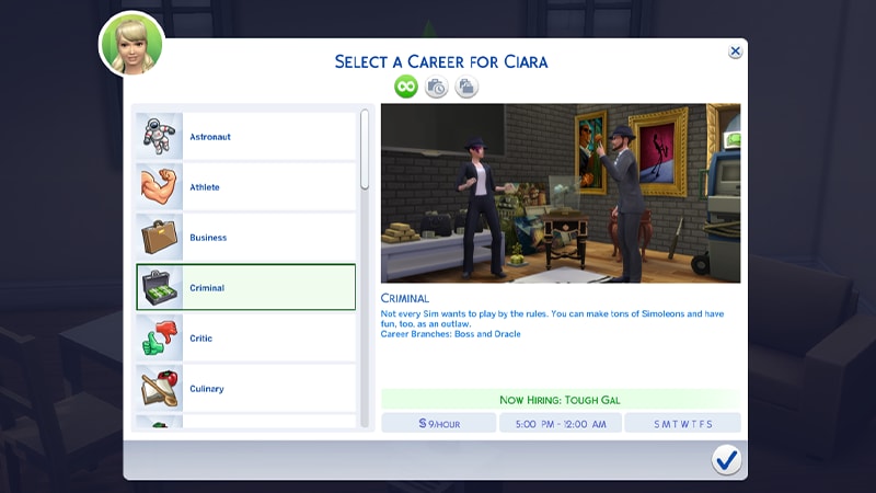A menu for choosing a career in The Sims 4 highlights the Criminal career showing the hourly rate, and working days/times.Here’s a breakdown of all ranks of the Criminal career.