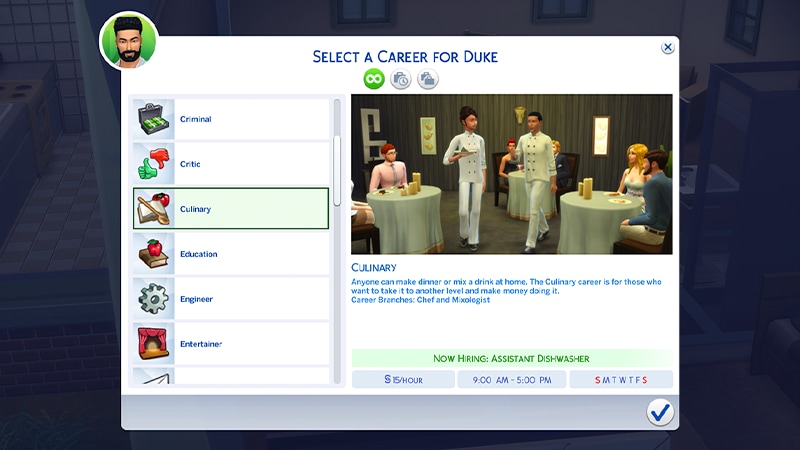 A menu for choosing a career in The Sims 4 highlights the Culinary career showing the hourly rate, and working days/times.Here’s a breakdown of all ranks of the Culinary career.