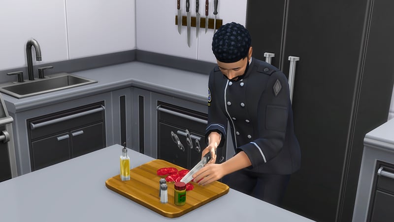 To join this career, select Find a Job from the phone or computer and choose Culinary. A Sim, wearing a chef’s outfit, chops tomatoes on a wooden cutting board in a modern black and silver kitchen.