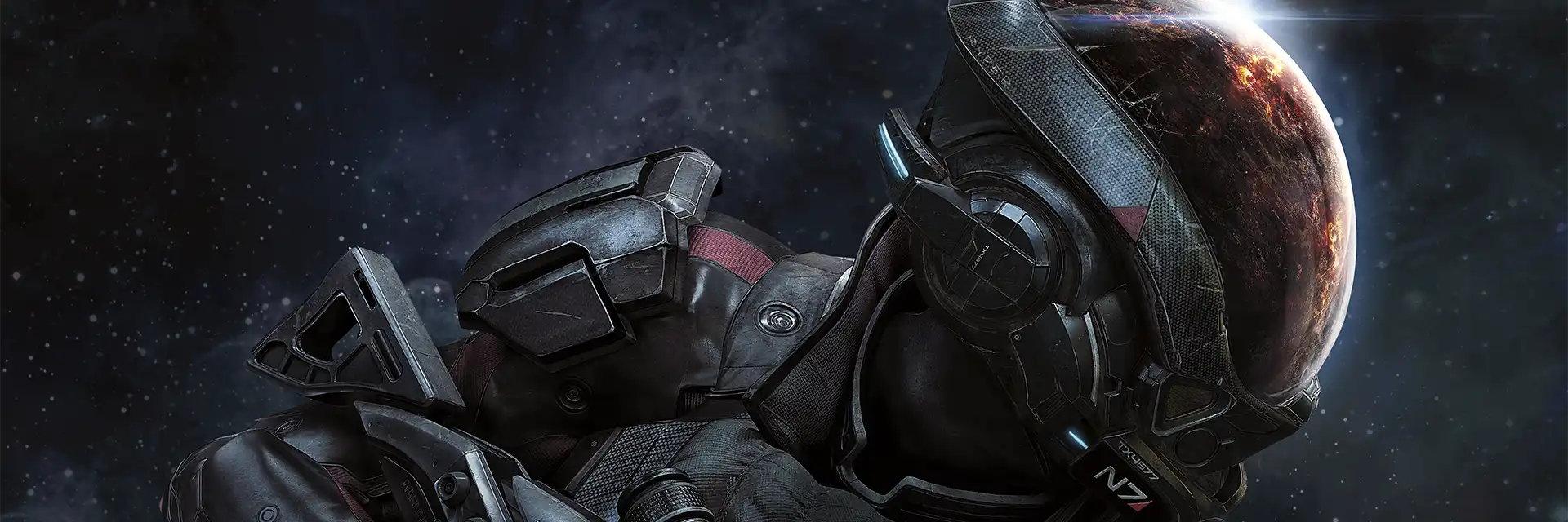 The hero in Mass Effect: Andromeda is shown wearing N7 armor and looking into space with a planet reflected in their helmet.