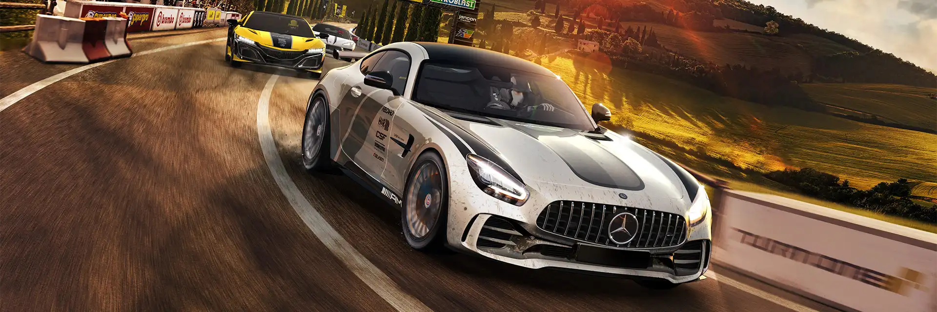 A white Mercedes-AMG GT R with racing decals and a black stripe on the hood, shown in a dynamic stance from the front.