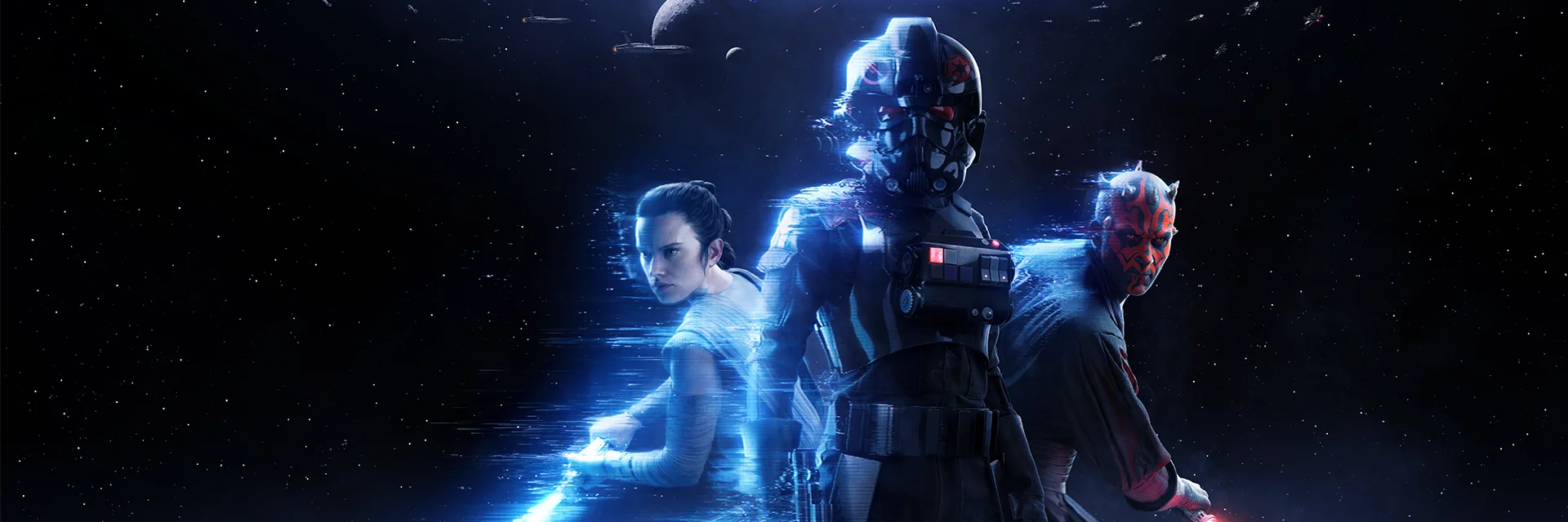 Rey, a TIE pilot, and Darth Maul stand against a starry sky in Star Wars: Battlefront II key art.